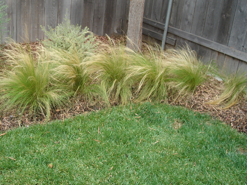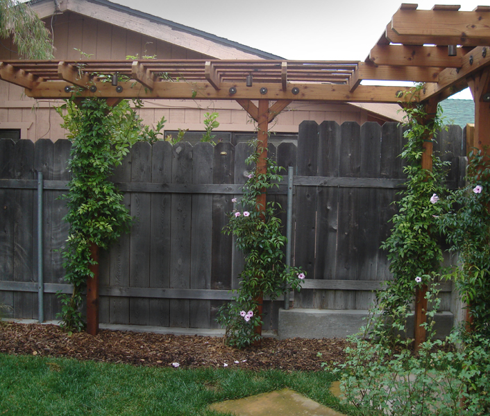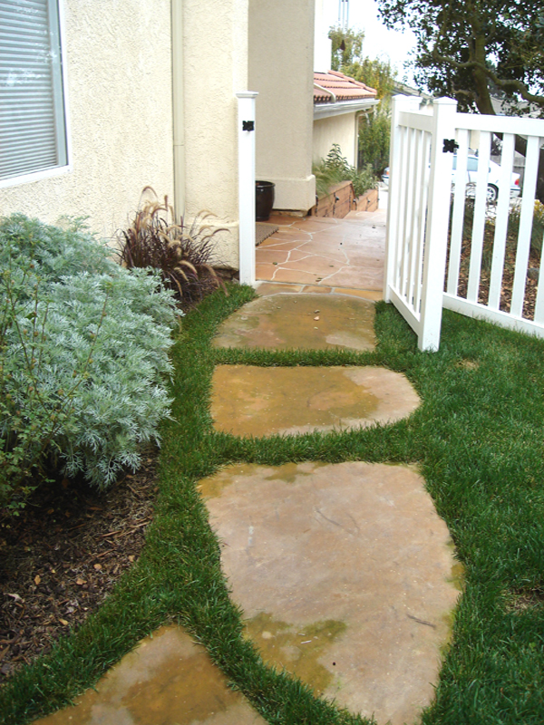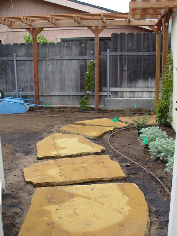 This project was designed and installed by All Seasons Gardening and Landscaping. This landscape features a large dry creek bed, flagstone, etched and stained concrete, custom woodwork, outdoor lighting, beautiful copper wall art and drought tolerant plants. Concrete staining and custom etching provided by Burch Concrete Solutions.