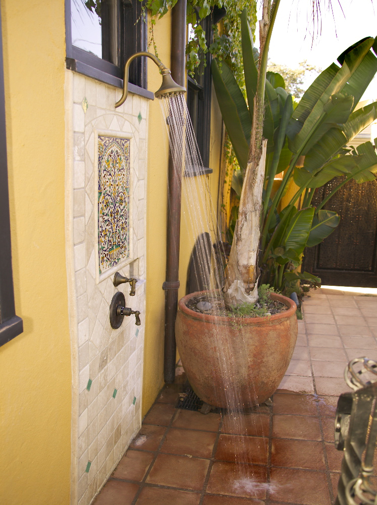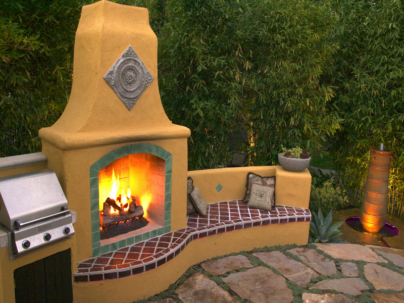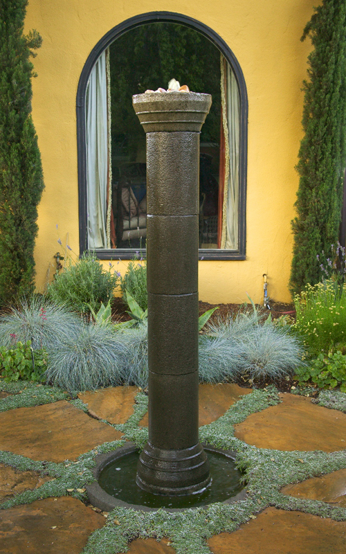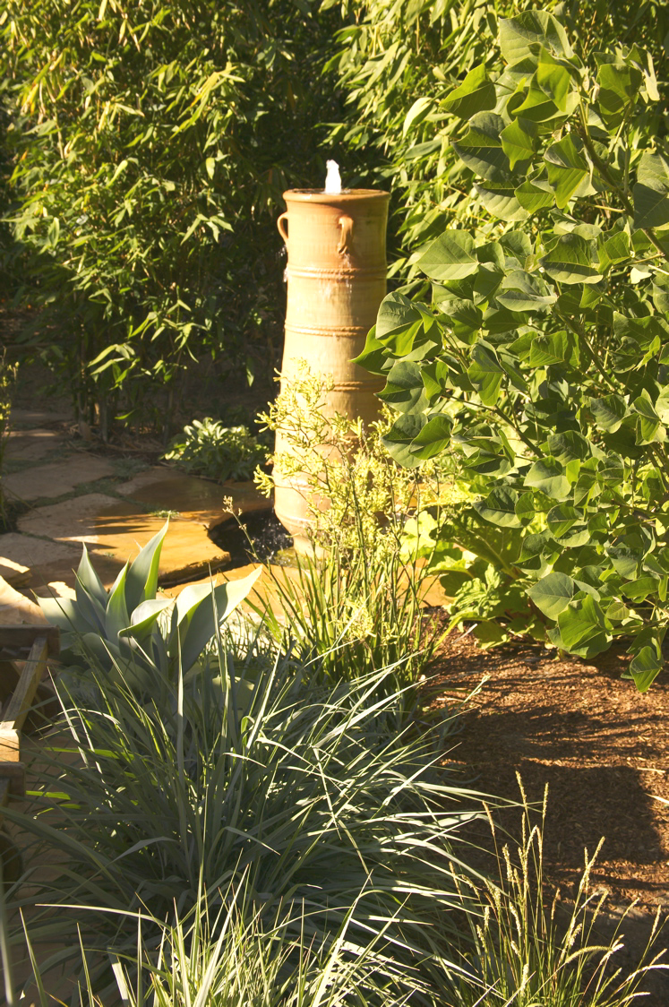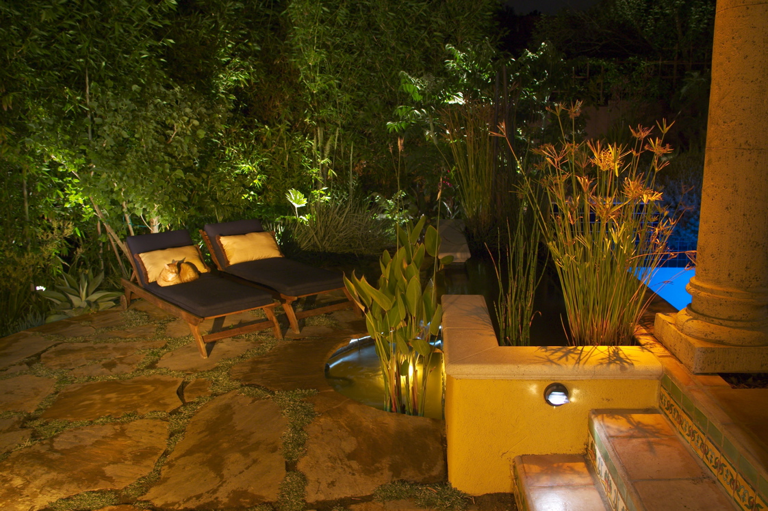 This project was designed by Jeffrey Gordon Smith Landscape Architect. This landscape features an outdoor fireplace, seating area, multiple water features, decorative art, and fiber optic lighting. This landscape was installed by Terra Nova, Day Star Enterprises, in conjunction with All Seasons G & L