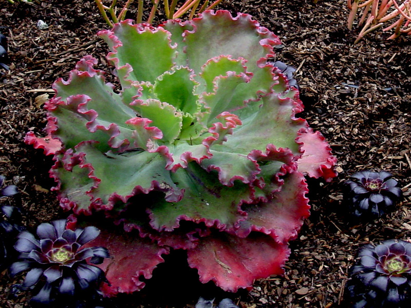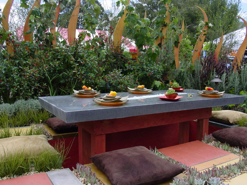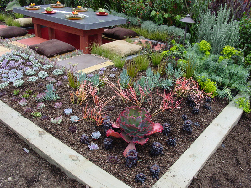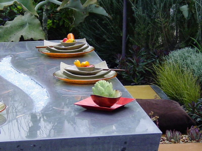 This project won the People's Choice Award at the 2003 San Luis Botanical Garden Festival. This landscape features a recessed concrete fire table inlaid with copper and mother of pearl and then polished. Masses of succulents and drought tolerant perennials add to the beauty of this exhibit.
