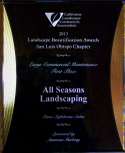 Erik is a two-time president of the local chapter of the California Landscape Contractors Association (CLCA) and a member of the Arroyo Grande and San Luis Obispo Chamber of Commerce. His honors and awards include: "Top 40 under 40" by the Pacific Coast Business Times, 2004; the cover story for the San Luis Obispo Tribune April of 2004; and the People's Choice Award at the Garden Festival, San Luis Obispo, 2003. Additionally, Erik is active in the San Luis Obispo Botanical Garden and sponsors a local soccer team.
