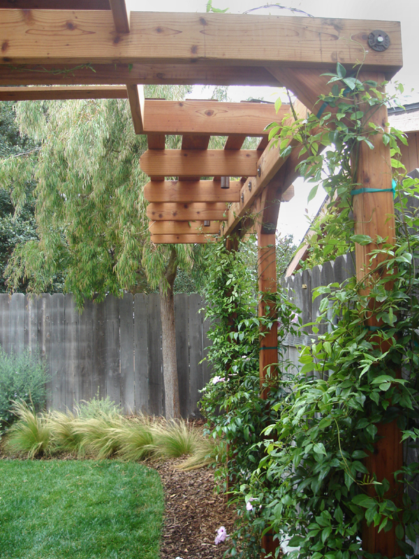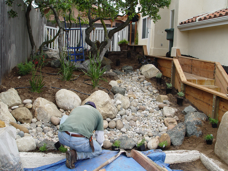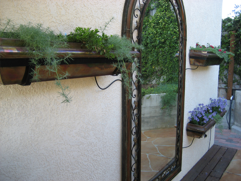This project was designed and installed by All Seasons Gardening and Landscaping. This landscape features a large dry creek bed, flagstone, etched and stained concrete, custom woodwork, outdoor lighting, beautiful copper wall art and drought tolerant plants. Concrete staining and custom etching provided by Burch Concrete Solutions.